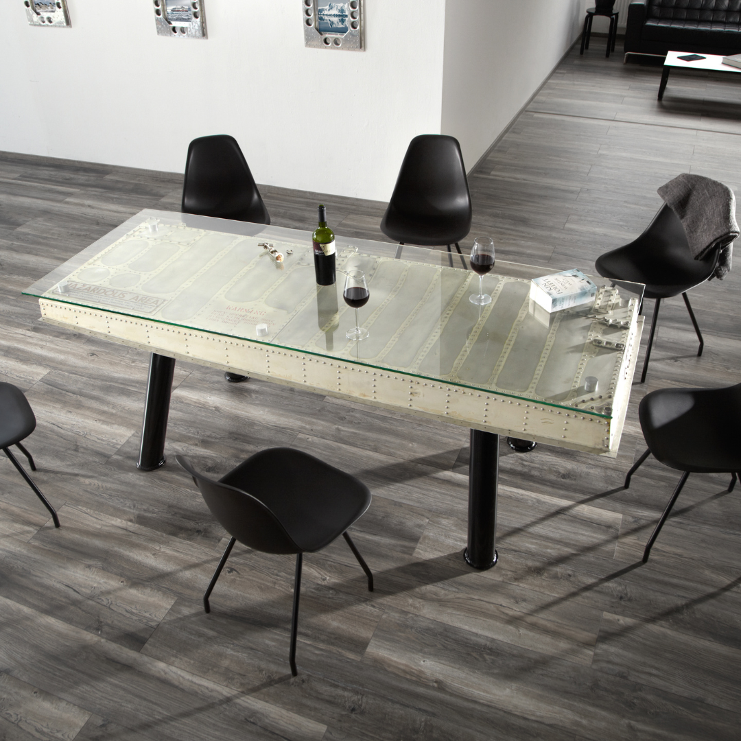 Jeder Tisch ist ein Unikat – gefertigt aus Flugzeugteilen mit Geschichte. Ob als markanter Couchtisch, repräsentativer Konferenztisch oder außergewöhnlicher Esstisch: Skypak-Tische schaffen Gesprächsstoff und Raumwirkung.