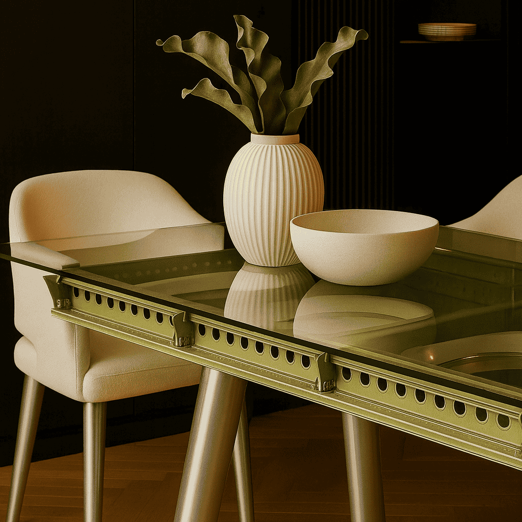 Jeder Tisch ist ein Unikat – gefertigt aus Flugzeugteilen mit Geschichte. Ob als markanter Couchtisch, repräsentativer Konferenztisch oder außergewöhnlicher Esstisch: Skypak-Tische schaffen Gesprächsstoff und Raumwirkung.